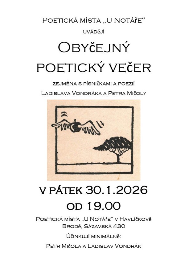 Obyčejný poetický večer zejména s písničkami a poezií Ladislava Vondráka a Petra Mičoly. A uvidíme, co nás ještě napadne.